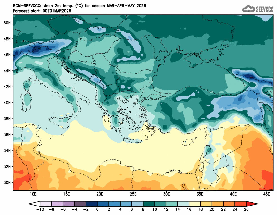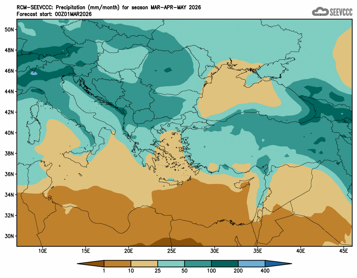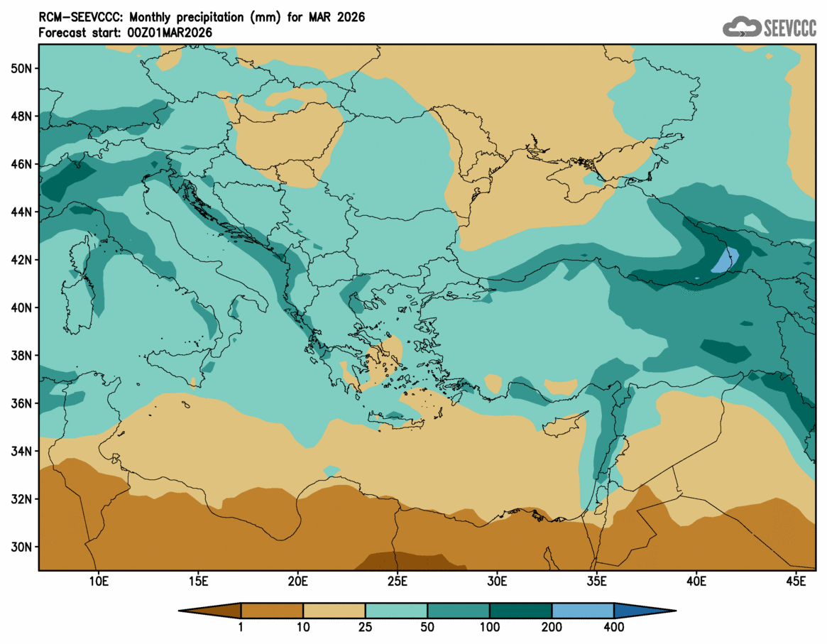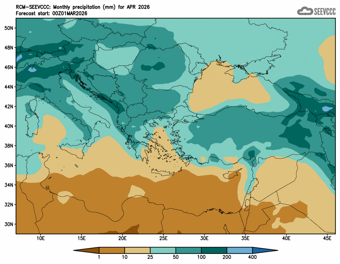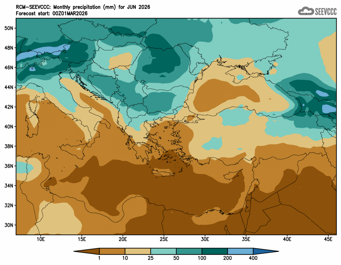SEEVCCC started to issue seasonal forecast for South East Europe region from June 2009. The system is based on dynamical downscaling of ECMWF seasonal forecast, using a regional atmosphere-ocean coupled model (RCM-SEEVCCC). The forecast consists of 41 ensemble members and is issued ones per month between 15th and 20th of a current month. The forecast run is for 7 months. Horizontal resolution is 0.25 degrees for atmospheric model and 0.2 degrees for the ocean model. Atmosphere is resolved with 32 and ocean with 21 vertical levels. The connection between the two components is through a coupler that performs the exchange of atmospheric surface fluxes and SST after every atmospheric physical time step. Exchanged fluxes are calculated using the atmospheric component and are used directly, without any additional parametrization.
