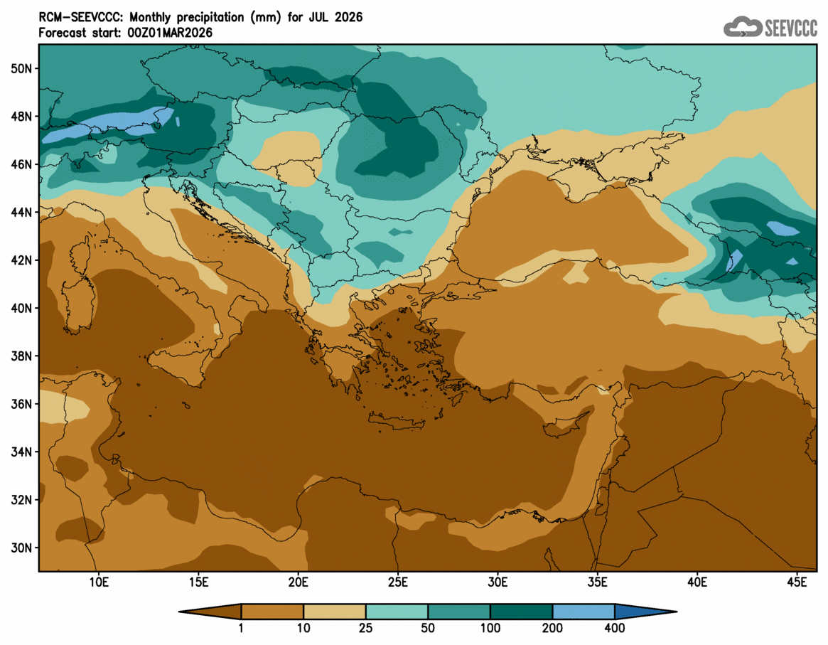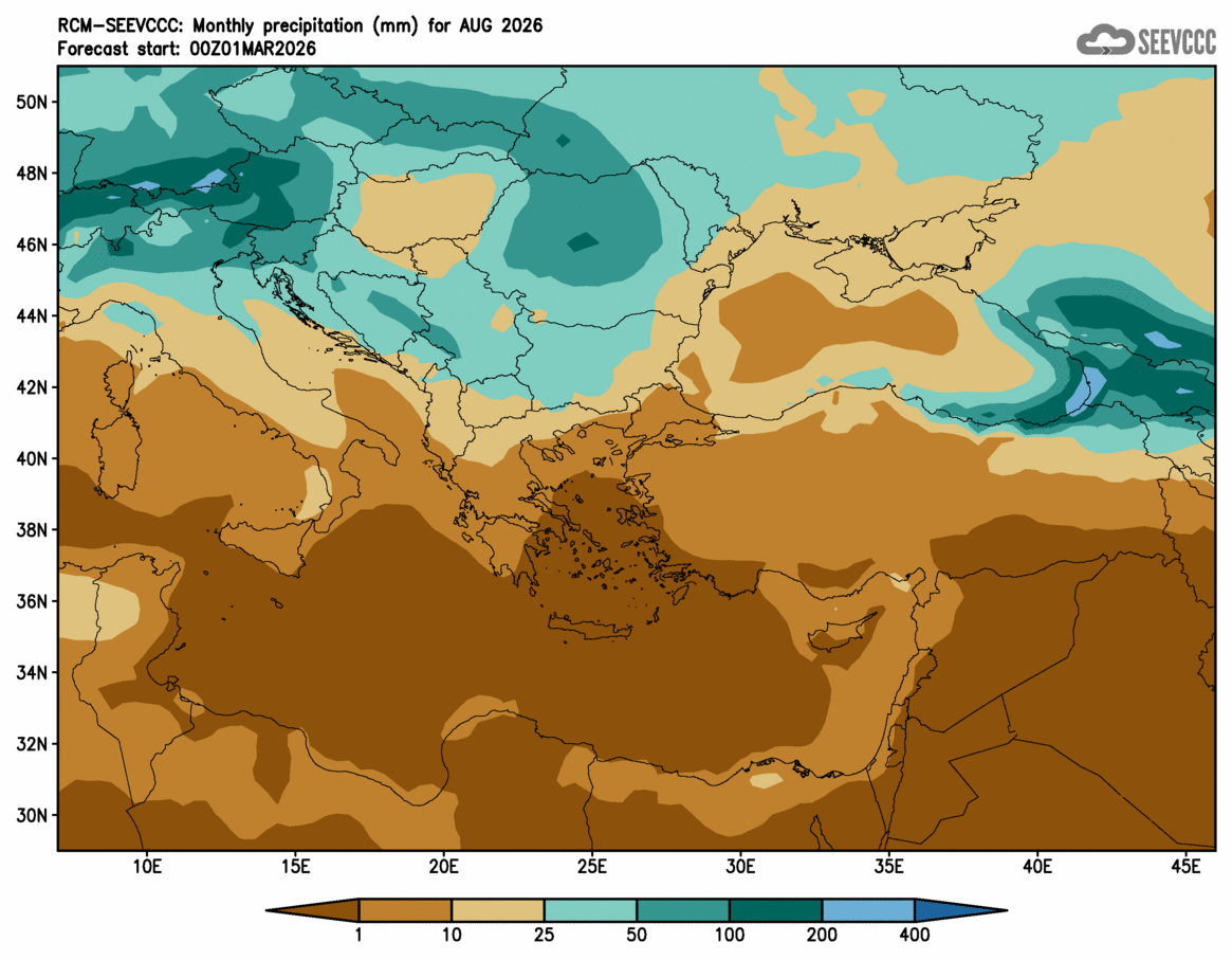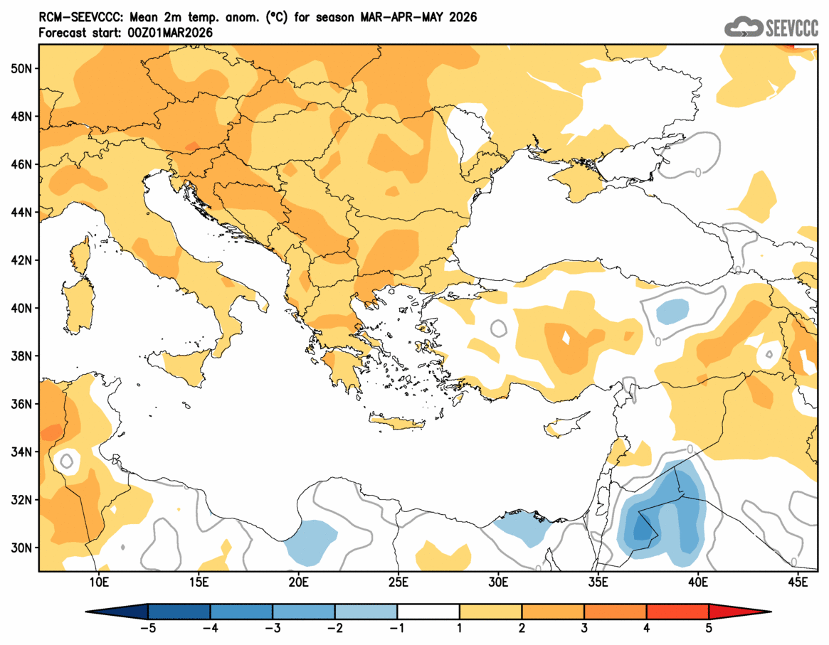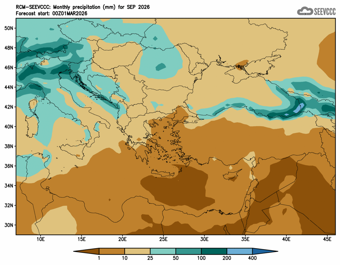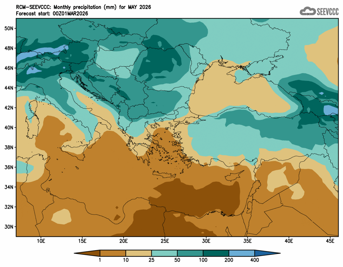 SEEVCCC started to issue seasonal forecast for South East Europe region from June 2009. The system is based on dynamical downscaling of ECMWF seasonal forecast, using a regional atmosphere-ocean coupled model (RCM-SEEVCCC). The forecast consists of 41 ensemble members and is issued ones per month between 15th and 20th of a current month. The forecast run is for 7 months. Horizontal resolution is 0.25 degrees for atmospheric model and 0.2 degrees for the ocean model. Atmosphere is resolved with 32 and ocean with 21 vertical levels. The connection between the two components is through a coupler that performs the exchange of atmospheric surface fluxes and SST after every atmospheric physical time step. Exchanged fluxes are calculated using the atmospheric component and are used directly, without any additional parametrization.