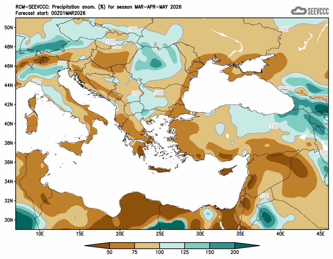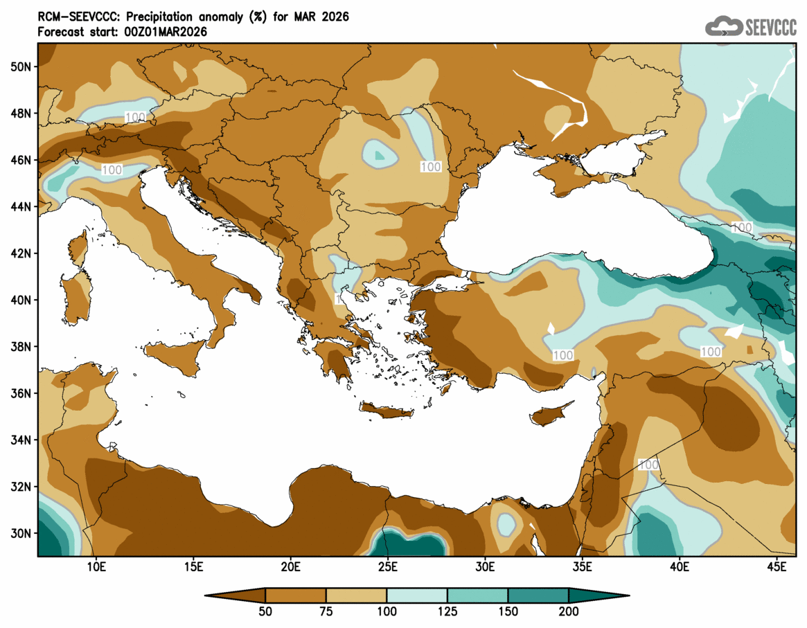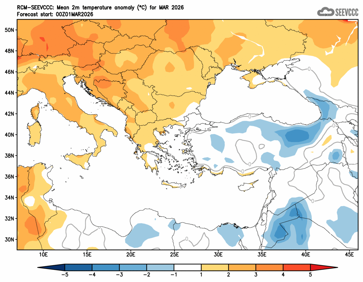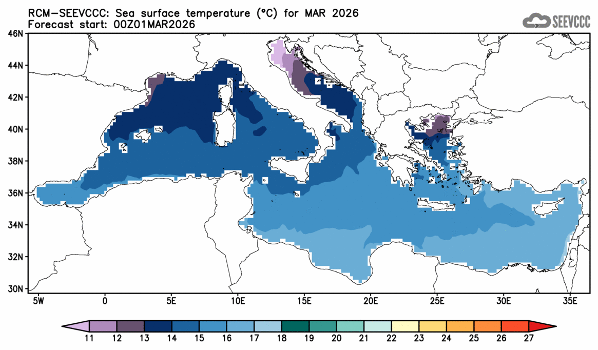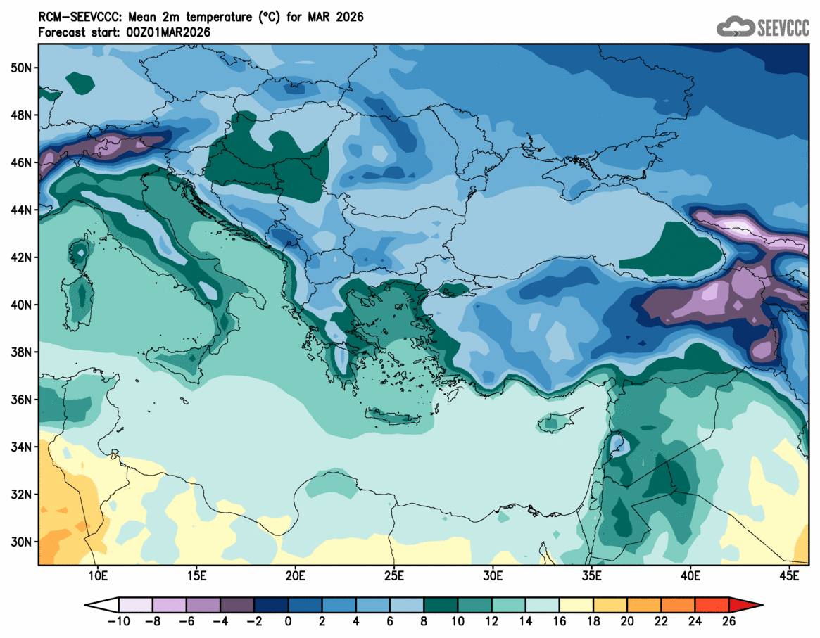 SEEVCCC started to issue seasonal forecast for South East Europe region from June 2009. The system is based on dynamical downscaling of ECMWF seasonal forecast, using a regional atmosphere-ocean coupled model (RCM-SEEVCCC). The forecast consists of 41 ensemble members and is issued ones per month between 15th and 20th of a current month. The forecast run is for 7 months. Horizontal resolution is 0.25 degrees for atmospheric model and 0.2 degrees for the ocean model. Atmosphere is resolved with 32 and ocean with 21 vertical levels. The connection between the two components is through a coupler that performs the exchange of atmospheric surface fluxes and SST after every atmospheric physical time step. Exchanged fluxes are calculated using the atmospheric component and are used directly, without any additional parametrization.